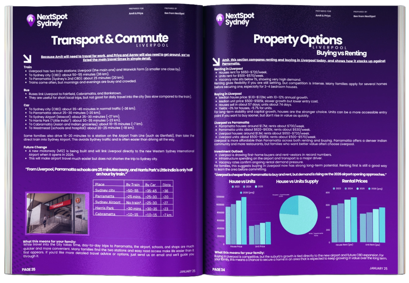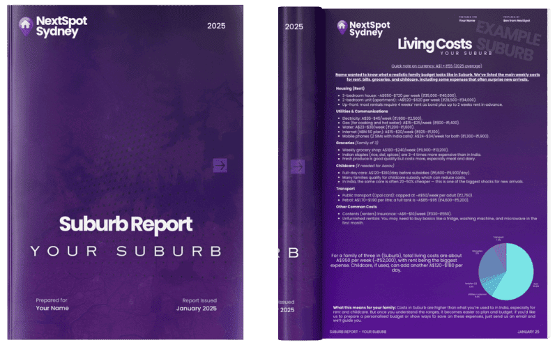 20–25 pages focused on your chosen suburbRent & cost-of-living breakdowns (housing, groceries, transport)Commute routes & transport mapped clearlySchool zones & catchments explainedLocal tips that speed up settling in2 recommended Suburb alternatives